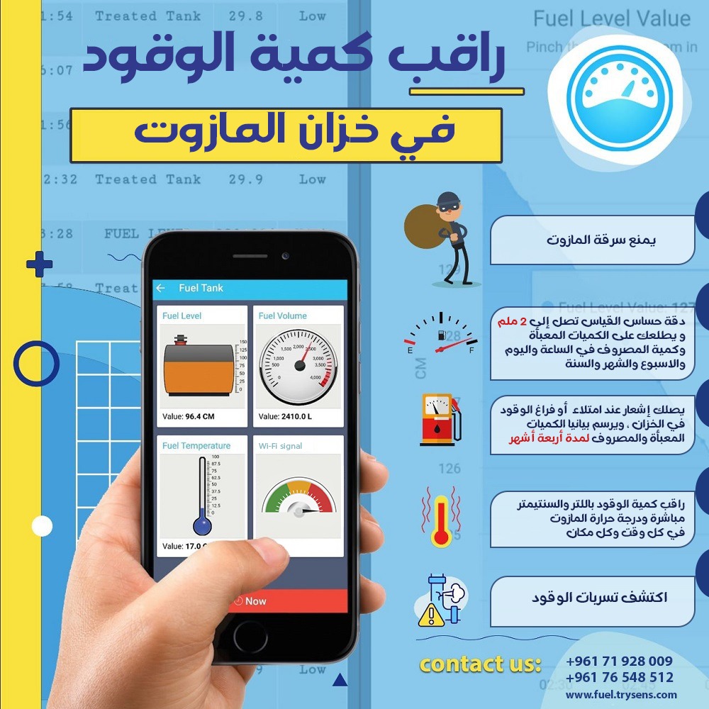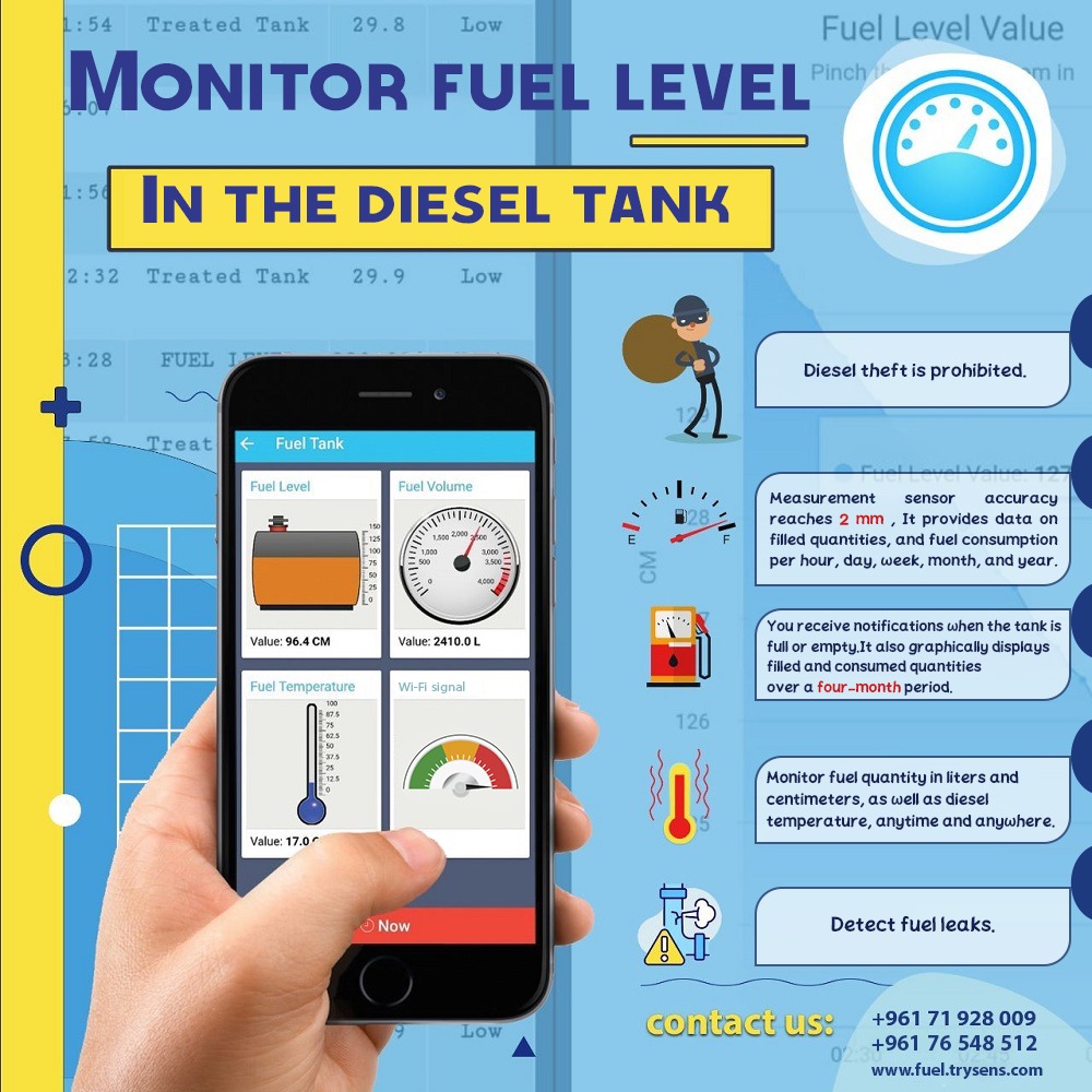 using loT technology. The Trysens fuel level monitoring system captures real-time data and instantly sends it to your mobile devices,